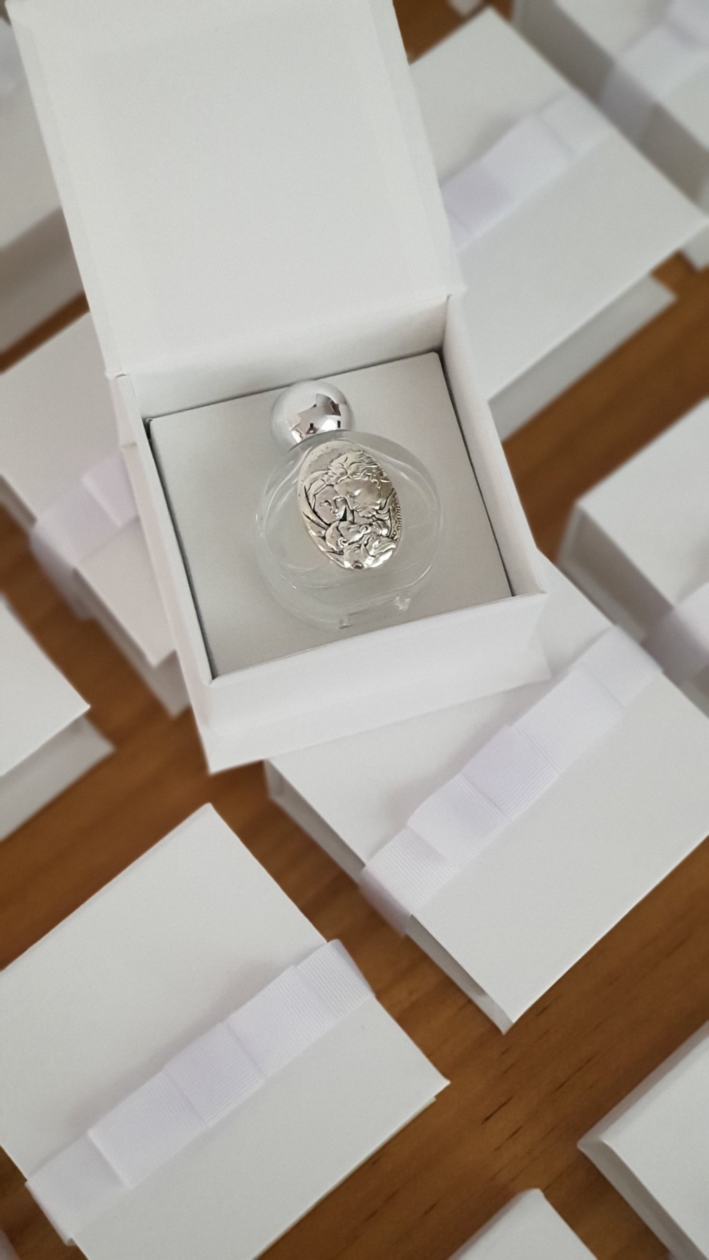 Vidrinho de Água Benta: Frasco redondo com tampa prata, perfeito para abençoar quem você ama.